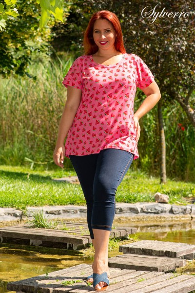Un top cu umerii căzuți, un decolteu rotund frumos, linii libere și o lungime care ajunge sub linia șoldului. Il poti purta si cu fusta, este un top din bumbac natural, placut, cu model vesel pentru vara.