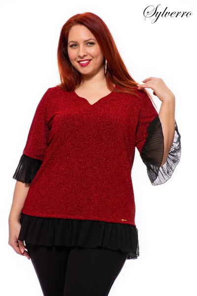 Un top confortabil, care nu ustură, casual, strălucitor, care ține bine. Îl poți purta la orice ocazie, la o petrecere de companie, la cină sau la teatru. Este realizata cu decor de muselina plisata in partea de jos si la capetele manecilor. O piesa unica, sofisticata. Datorită tăieturii sale frumoase curbate și potrivirii bune, arată bine pe fiecare silueta. Merge bine și cu o fustă.