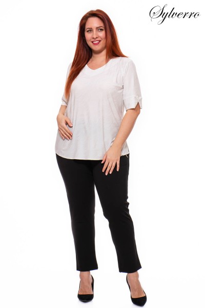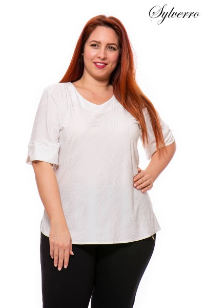 Un top drăguț cu mâneci până la cot, o curea la capătul mânecilor și o potrivire lejeră. Materialul său moale, dar durabil, nu se lipește de corp. Nu se șifonează și este ușor de întreținut chiar și după spălare. Decolteul „V” alungește silueta. Există o presiune abia vizibilă pe fundalul alb.