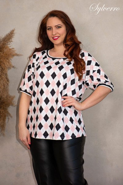 Această bluză damă mărimi mari cu model este alegerea perfectă pentru ținutele de zi cu zi, dacă îți dorești confort și stil în același timp. Modelul clasic cu romburi în negru și roz pudrat oferă un aspect elegant, dar modern și proaspăt.