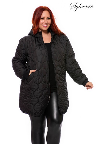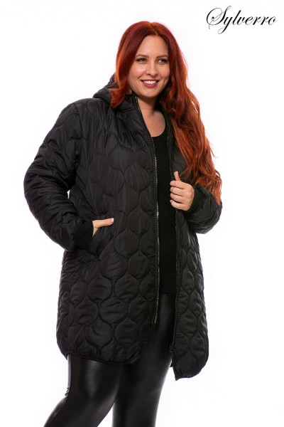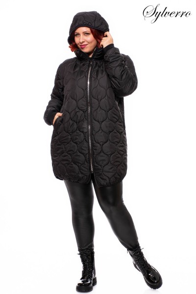 Jachetă neagră la modă, cu model sau simplu, matlasată, de grosime medie, ușoară. Gluga începe de la un guler înalt. Partea din față are șireturi decorative, iar mânecile sunt montate, astfel încât căldura să nu scape. Are buzunare, spatele ușor alungit și o lungime care ajunge sub jumătatea coapsei. Modelul are 180 cm inaltime! Realizat în culori la modă. XL-5XL