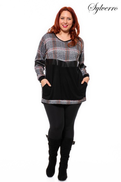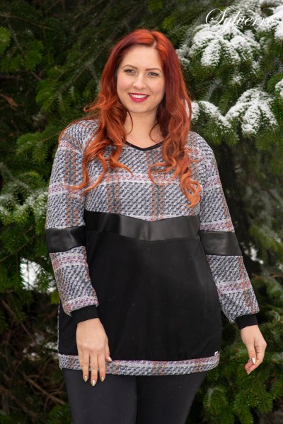Un hanorac alungit, până la jumătatea coapsei, confecționat din piele artificială și inserții negre solide. Datorită materialului său moderat cald, este confortabil de purtat toată ziua. Top la modă, cu buzunare și decolteu în „V”. Modelul are 185 cm înălțime, așa că arată mai scund la el.