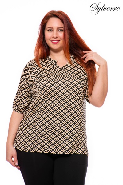 Un top alungit, cu mâneci până la cot și un frumos decolteu în „V”. Inserția laterală neagră și dungi din piele artificială întind și subțiază silueta.