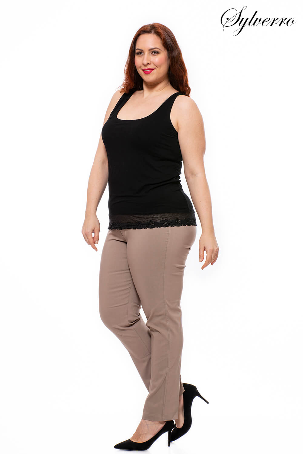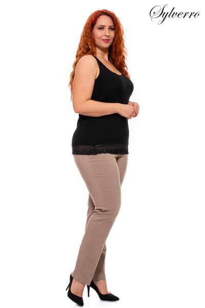 Pantaloni comozi, elastici, cu picioare conice și talie înaltă. Materialul său confortabil, care modelează forma, modelează bine silueta. Decorat cu știfturi de strass la deschiderea buzunarelor. Datorită taliei elastice, acești pantaloni sunt foarte comozi, dar tinerești și atemporale. Disponibil în mai multe culori.