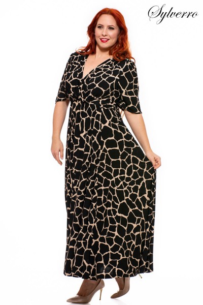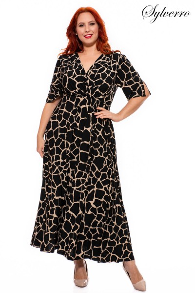 Rochie maxi cu o deschidere drăguță pe coapsa stângă, care este parțial ascunsă de fusta lejeră. Croiala suprapusă a părții superioare oferă un decolteu feminin și un aspect la modă. Rochia are o talie elastica plasata sub bust. O rochie confortabilă, elegantă și tinerească, care este făcută și mai izbitoare de materialul frumos.