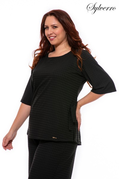 „Un top drăguț, în linie A, confecționat dintr-un material plăcut, la modă, cu model. Este decorat cu un mic tricotaj pe lateral, fiind o alegere perfectă pentru ocazii elegante și blugi casual.”
