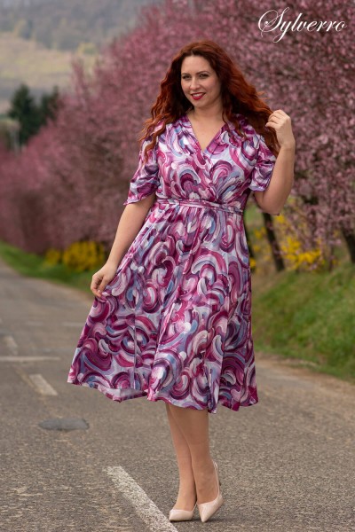 O rochie drăguță, elegantă, până la genunchi, cu o deschidere în partea stângă care dispare parțial în fusta largi. Croiala suprapusă a părții superioare oferă un decolteu feminin și un aspect la modă. Rochia are o talie elastica plasata sub bust. O rochie confortabilă, elegantă și tinerească, care este făcută și mai izbitoare de materialul frumos.